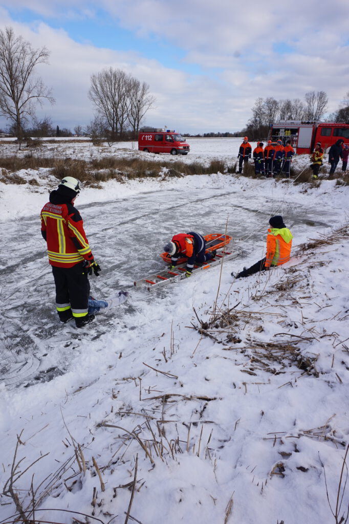 Auf dem Eis wurden verschiedene Möglichkeiten ausprobiert, wie eingebrochene Personen schnell, sicher und möglichst schonend gerettet werden können – denn gerade bei einer Eisrettung zählt jede Minute. Neben einer Kinderpuppe als Übungsobjekt konnten sich die Jugendlichen dabei auch gegenseitig „retten“ und so die Abläufe nahe an der Realität zu üben. Geübt wurde unter anderem mit Steckleiterteilen, der Schleifkorbtrage und dem Spineboard.