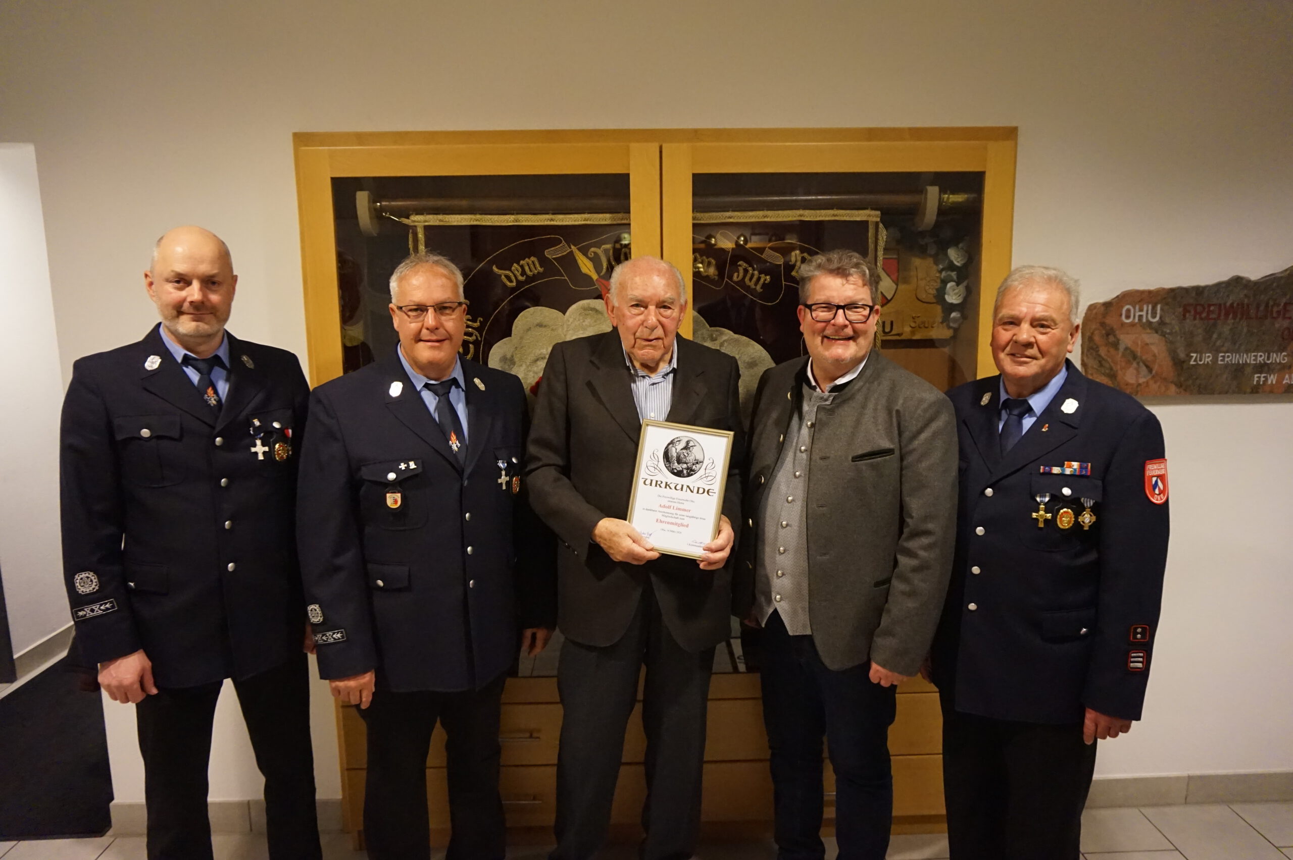 Für 73 Jahre Mitgliedschaft in der Freiwilligen Feuerwehr und zudem als ältestes passives Mitglied der FF Ohu wurde nach einstimmigem Beschluss der Vorstandschaft Kamerad Adolf Limmer zum Ehrenmitglied der FF Ohu ernannt. Adolf Limmer war als aktives Mitglied 20 Jahre in der Vorstandschaft als Kassier verantwortlich und war als langjähriger Fahnenträger sehr engagiert.